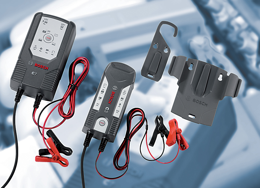 Bosch has the portable C3 and C7 chargers that feature current charging technology and self-monitoring function. They are suitable for all types of lead-acid AGM, wet or gel batteries with voltage ranges of 6/12 volts with the C3 and 12/24 volts with the C7. They are versatile and fully automatic, microcomputer controlled battery chargers that have an easy to use one-button operation. When a battery is fully charged, either charger switches automatically to maintenance mode (trickle charging), and can be left connected to the battery to keep a high charge level when a vehicle is not being used. The larger C7 charger also offers a Regeneration Mode to recover a short term, deeply discharged battery, as well as a power backup function which supplies continuous power to the vehicle’s electrical system while replacing the battery. If an abnormal situation occurs, the chargers switch automatically to standby mode.